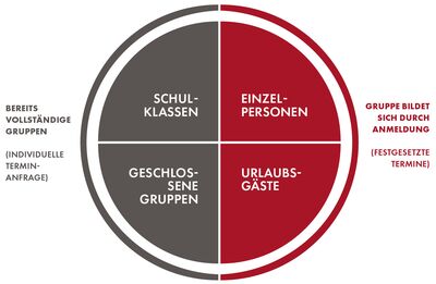 Die vier Anspruchsgruppen sind: Schulklassen, geschlossene Gruppen, Einzelpersonen und Urlaubsgäste. Charakterisierend für die beiden erstgenannten ist, dass sie bereits eine vollständige Gruppe zur Durchführung stellen und somit individuelle Termine anfragen können. Die beiden letztgenannten reagieren auf festgesetzte Termine und die Gruppe bildet sich erst durch Anmeldung und Erscheinen der Teilnehmer – daher werden entsprechende Veranstaltung durch das Museumsteam öffentlich beworben.